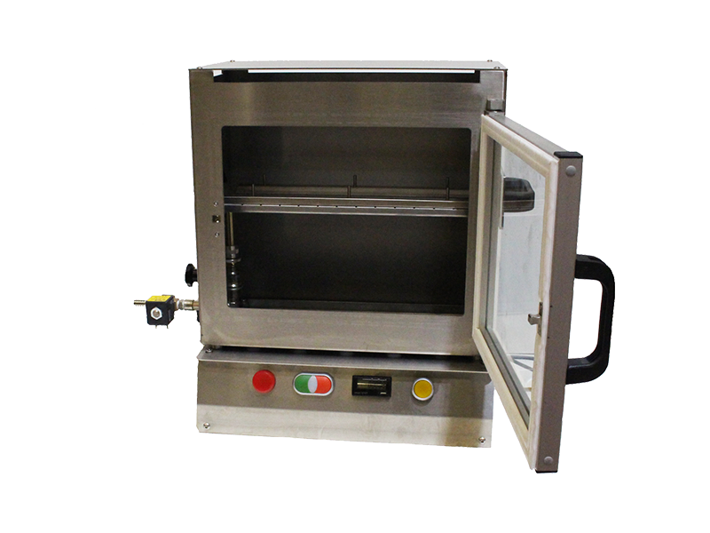En la Cabina de Inflamabilidad Horizontal, modelo CHSAT, se expone la muestra a la acción de una llama de baja energía durante 15 segundos. Esta prueba permite determinar cómo actúa la muestra: si la llama se extingue, en qué momento o el tiempo que tarda en recorrer una distancia dada.