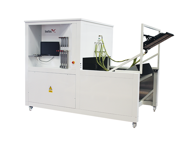 El equipo se compone de una zona para ensayos en la cual se coloca la muestra. Incluye también un panel radiante, un soporte porta-muestras, un quemador piloto, un sistema de extracción de humos y un puesto de control asociado a un sistema de medición.